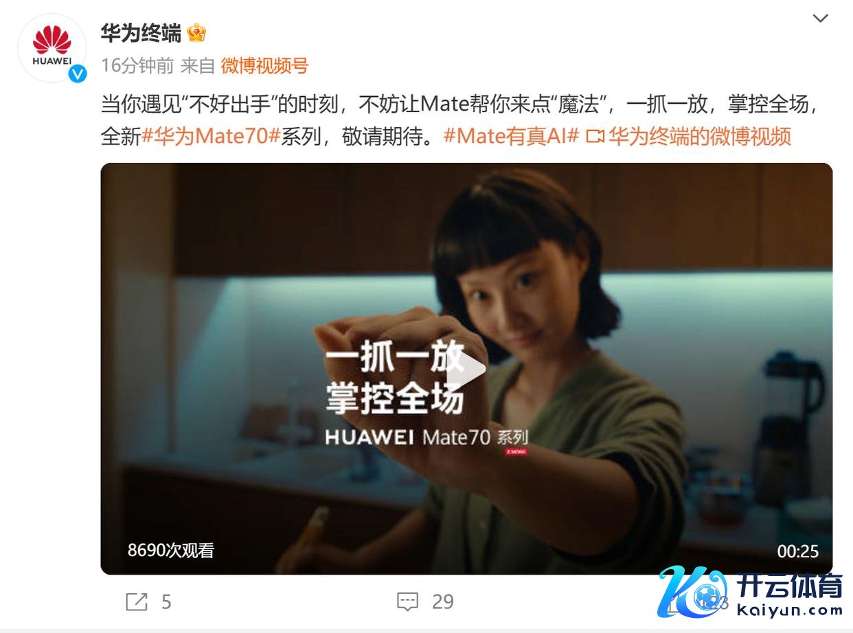 11月19日,华为结尾官方微博开释了三条对于华为Mate 70系列的视频,皆指向了新机的AI功能。对此,咱们不妨不错合理臆想,此次华为Mate 70系列或将在AI影像、AI手势时候、AI秘密安全三大方面带来更变功能与升级体验。
