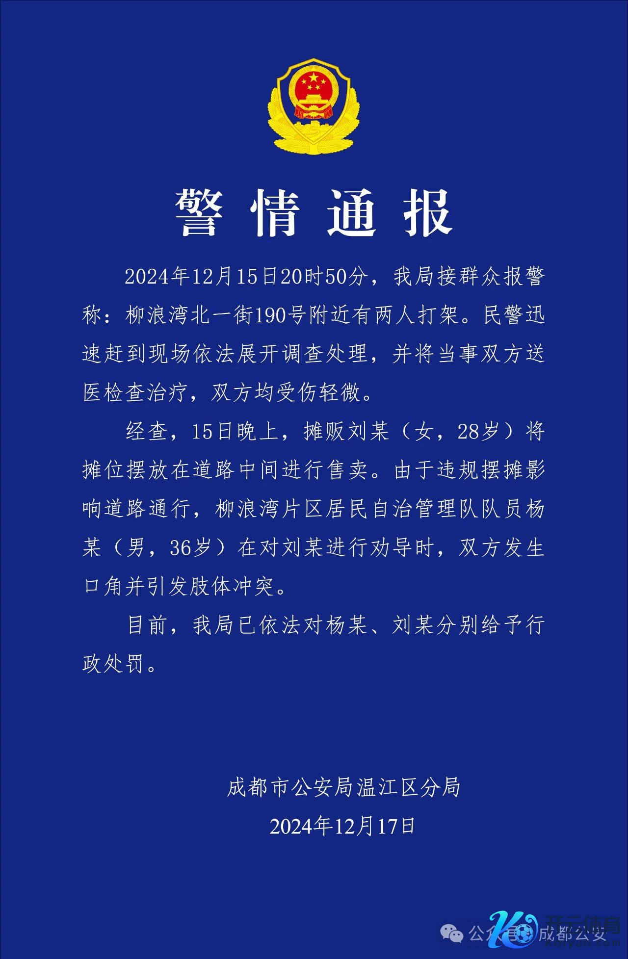 经查,15日晚上,摊贩刘某(女,28岁)将摊位摆放在谈路中间进行售卖。由于违章摆摊影响谈路通行,柳浪湾片区住户自治搞定队队员杨某(男,36岁)在对刘某进行劝导时,两边发生好坏并激励肢体破损。