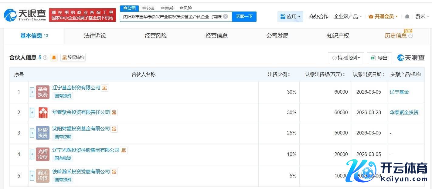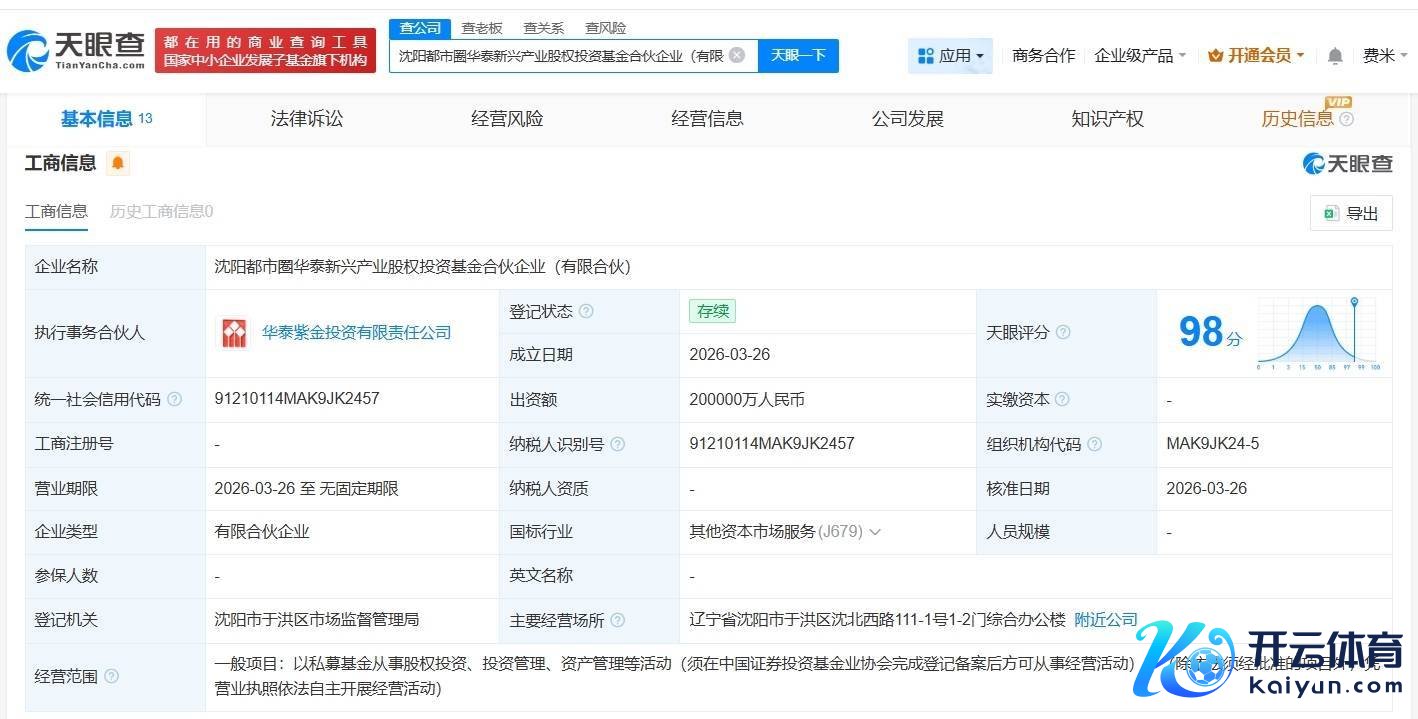 南边财经3月30日电,天眼查App浮现,近日欧洲杯体育,沈阳齐市圈华泰新兴产业股权投资基金合资企业(有限合资)征战,推行事务合资东谈主为华泰紫金投资有限连累公司,出资额20亿东谈主民币,谋略范围为以私募基金从事股权投资、投资处置、财富处置等活动。合资东谈主信息浮现,该基金由辽宁基金投资有限公司、华泰证券(601688)旗下华泰紫金投资有限连累公司、沈阳财盛投资基金有限公司等共同出资。