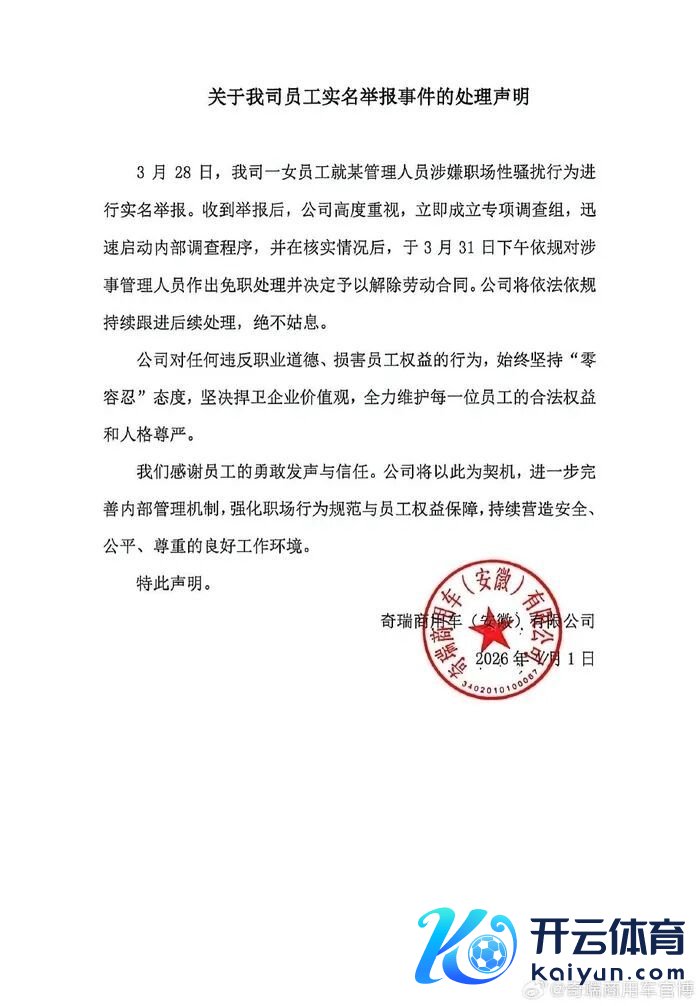 针对该举报事件,4月1日下昼,奇瑞商用车(安徽)有限公司通过官方微博发布《对于我司职工实名举报事件的处理声明》,作出认真复兴。声清楚示,公司已于3月28日收到该女职工对于某处置东说念主员涉嫌职场性扰攘的实名举报,收到举报后第一工夫确立专项看望组,速即脱手里面看望设施。经核实关连情况后,公司已于3月31日下昼依规对涉事处置东说念主员作出免职处理,并决定铲除工作协议,同期明确将照章依规握续跟进后续处理,毫不姑息。