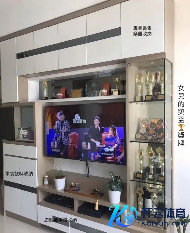 小细节:电视柜右侧玻璃柜格塞满女主男儿的奖杯和奖牌。用女主的话说:大男儿从幼儿园到初中,全是年龄第别称,奖状塞了一整箱~