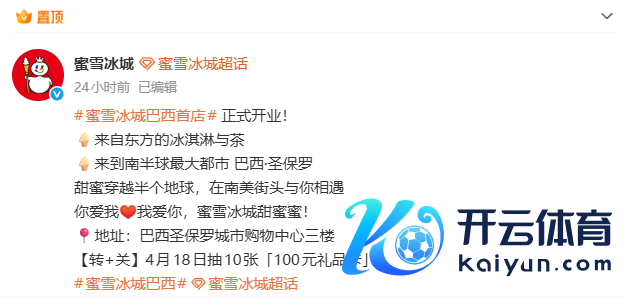4月12日,蜜雪冰城官方微博发布“蜜雪冰城巴西首店开业”的规划信息。本色走漏,当地时刻4月11日,蜜雪冰城南好意思首店暨巴西保利斯塔店在圣保罗城市购物中心开业。